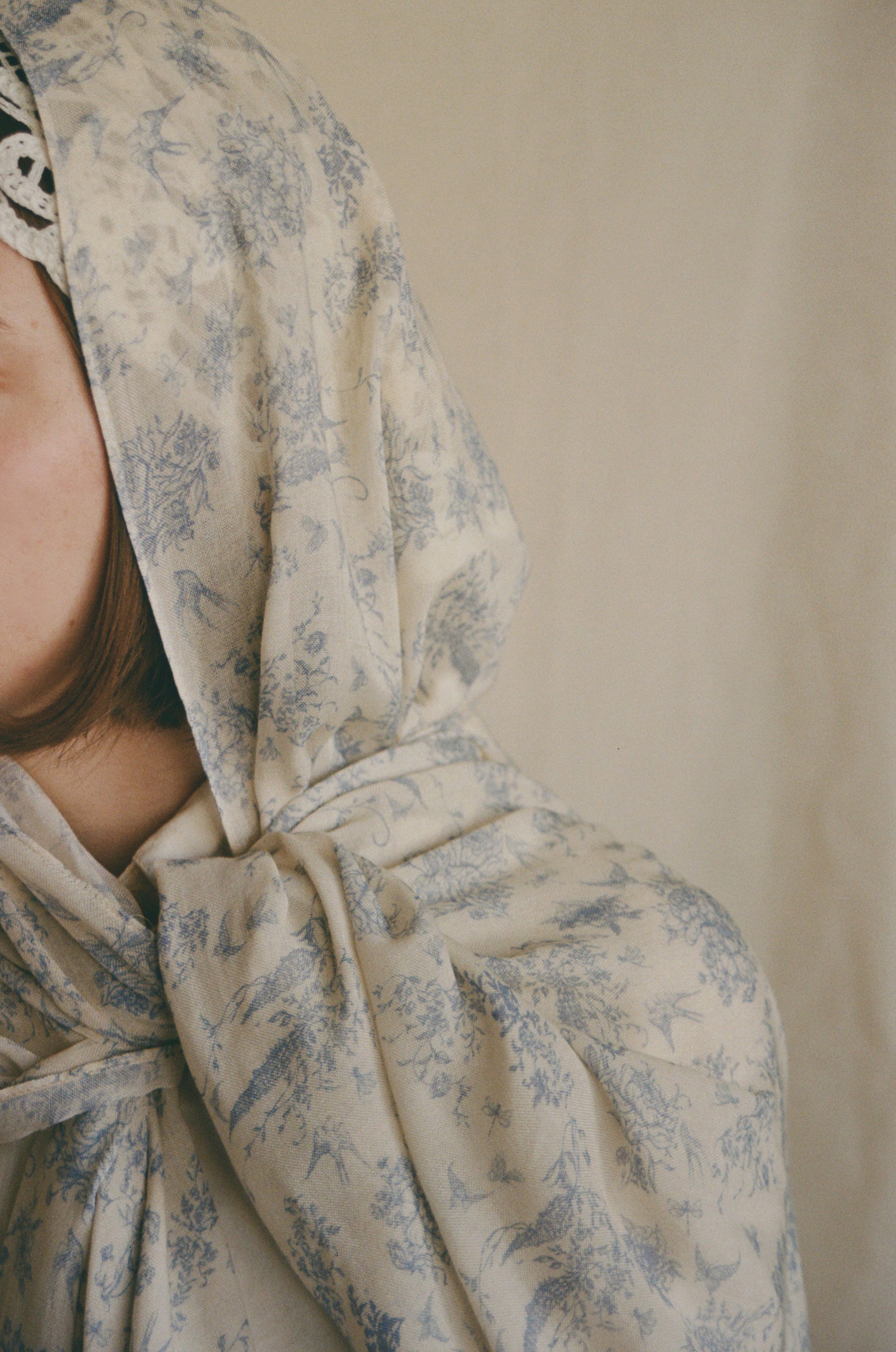 A timeless floral reverie in soft blue and ivory, evoking the warmth of home and the charm of an antique garden. The perfect print to wear for this spring, bringing a touch of vintage beauty to every moment and adding a refreshing, delicate bloom to your wardrobe.